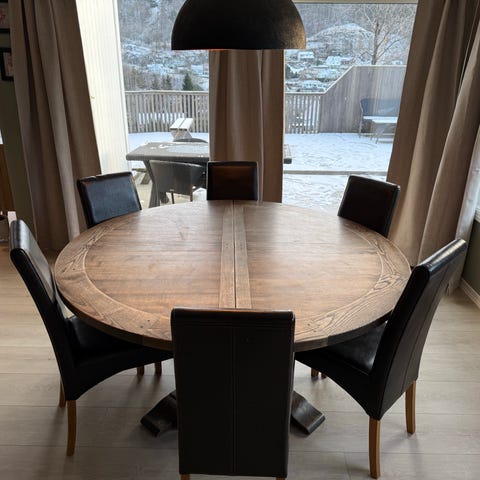 Boston rundt spisebord fra Fagmøbler selges. Spisebordet har en diameter på 140cm og selges med to ileggsplater på 50cm, som gjør at bordet blir 240cm langt.