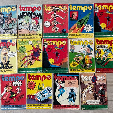 Samling av Tempo tegneserie blader med ulike omslag og temaer. Inneholder flere utgaver med forskjellige historier og illustrasjoner.