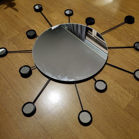 IKEA SKÅBU speil med uregelmessig form. Speilet har en grå bakside og er designet for veggmontering. Passer til bruk i ulike rom for å gi refleksjon og dekorasjon.