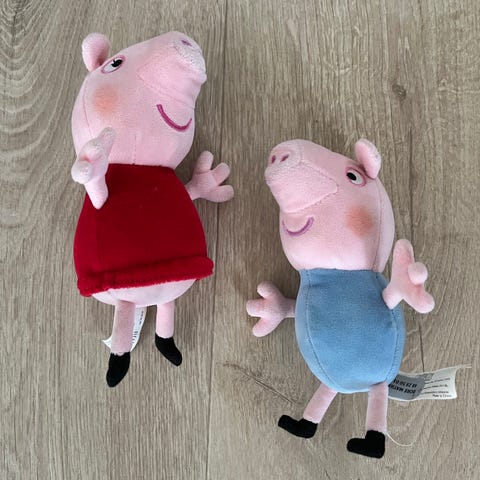Peppa Gris bamser sett med to myke kosedyr i samme størrelse. Inkluderer karakterer fra Peppa Gris-serien med detaljer som klær og tilbehør. Laget av stoffmateriale, egnet for barn. selges mot henting.