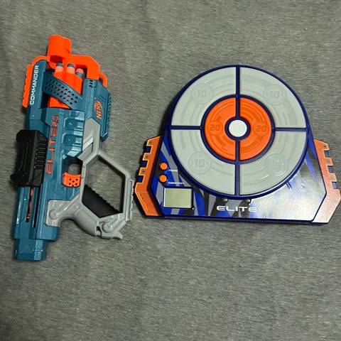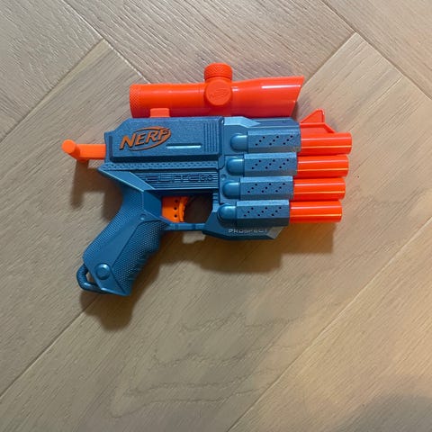 Leveres med flere skumprosjektiler og et ekstra løpforlenger med sikte. Løpet fulgte med en annen Nerf, men den er ødelagt. Så det kan følge med uten ekstra kostnad.