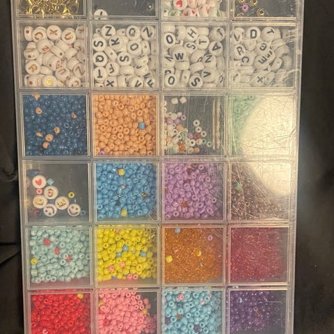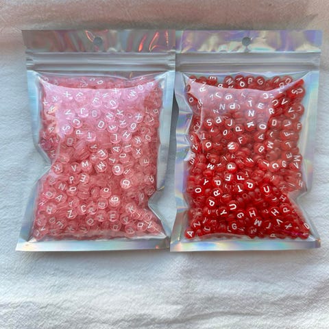 Mange bokstavperler, usikker hvor mange. (1500+?). Kommer med praktisk oppbevaringsboks og en rull med strikk. Tror ikke det er æ,ø,å.
