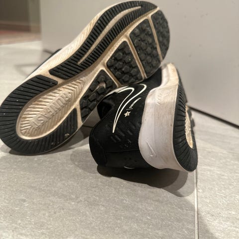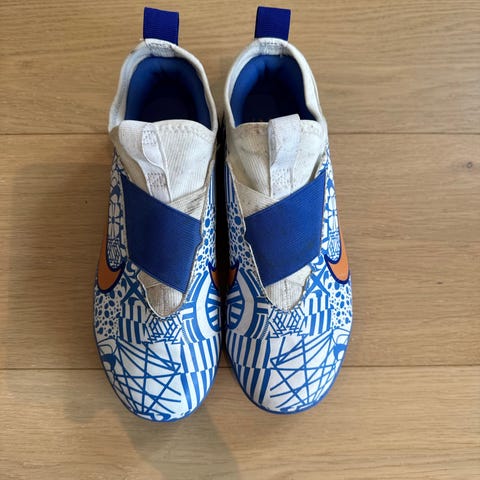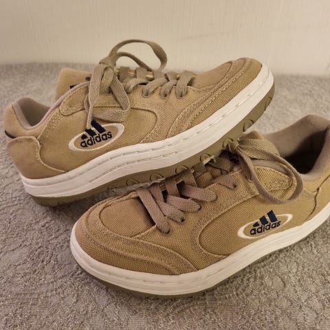 Adidas barne joggesko i størrelse 37 1/3 , designet for gutter. Skoene har en grå overdel med blå detaljer og gule innslag på hæl og såle. Materialet er pustende og egnet for aktiv bruk.