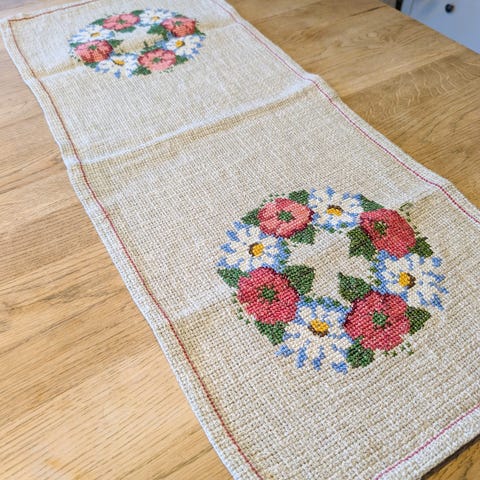 Retro duker. Blårutete med broderte hjerter og blomster. Frynser på alle.