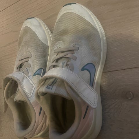 Nike unisex joggesko i størrelse 32, svart farge. Skoene har en hvit såle og borrelås for enkel justering. Egnet for daglig bruk og ulike aktiviteter.