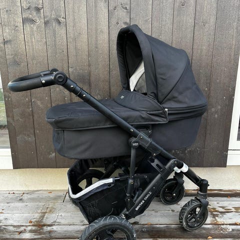Britax smile barnevogn selges. Sportdel og bagdel. Bagdel i beige, sportdel i svart/grå. Følger med regntrekk og myggnett.
