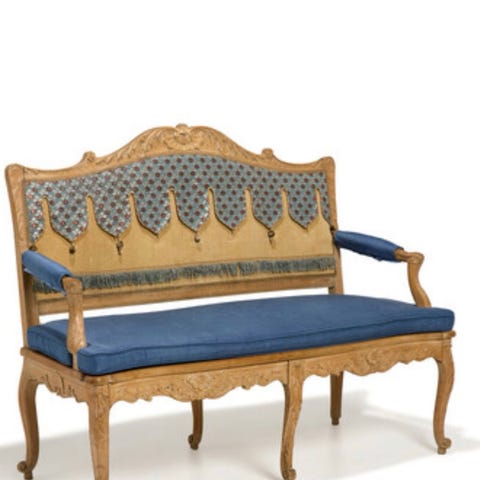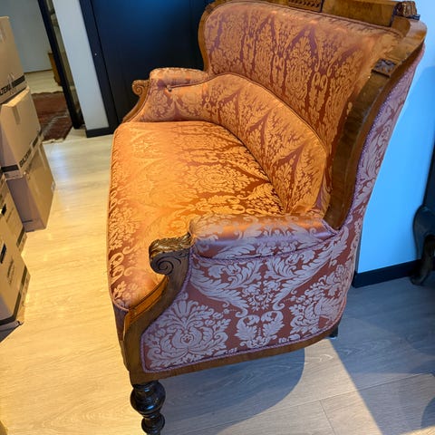 Rokokkosofa i gult stoff, har vært i mitt eie i 20 år og blitt pent behandlet. Fikk vite når jeg kjøpte den at den er fra rundt 1880-1890. Veldig velholdt, reparert på toppen en gang. Putene er pene i formen. Ingen flekker og stoffet er helt og pent. Nydelig møbel, godt å sitte i.