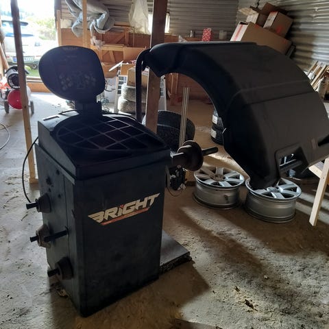 Selger min dekkomlegger med hjelpearm og avballanseringsmaskin med noe vekter til å slå på å lime på felgen.