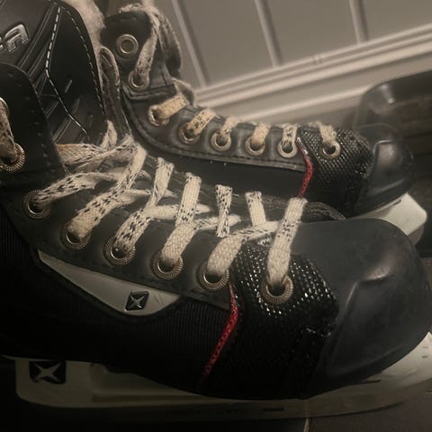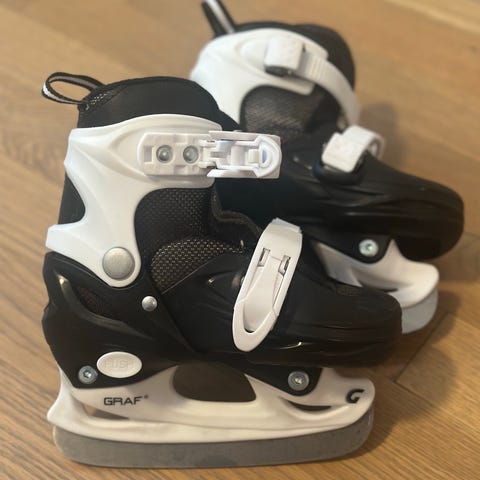 Team Canada Ishockey barneskøyter i størrelse 28. Skøytene har svart og hvit farge med dekorative elementer som maple leaf og Canada-logo. Egnet for barn som driver med ishockey.