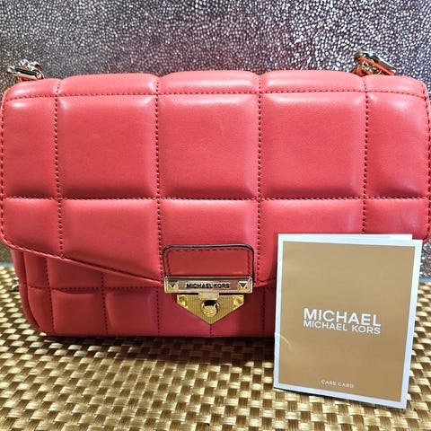 Den har justerbar skulderrem og metallspenne med Michael Kors-logo.