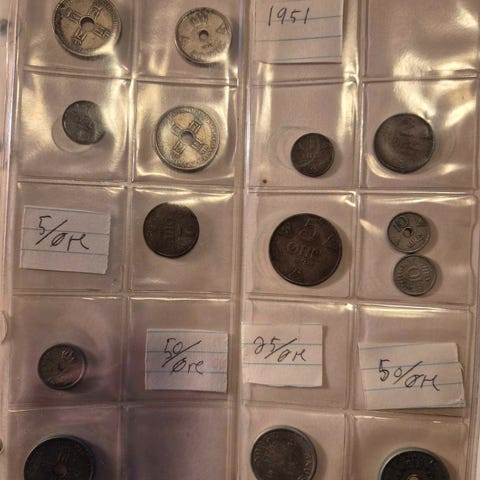 Myntalbum for norske 5-øre mynter med årstall fra 1875 og fremover. Albumet har plass til mynter i forskjellige årganger og inkluderer hull for å sette inn mynter. Rødt omslag med tekst på forsiden.