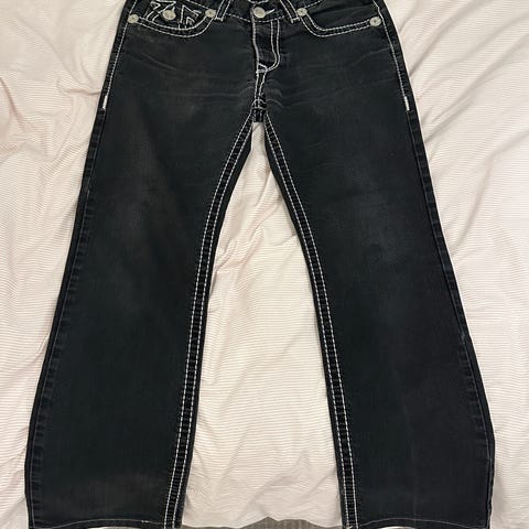 Original True Religion jeans i størrelse 38. Klassisk mørk denim med ikoniske baklommer. Noe normal slitasje, ellers i bra stand.