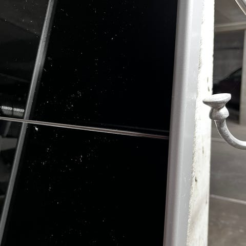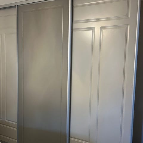 Skyvedører 4 stk med tak- og gulvskinner. Hver skyvedør er 101 cm bred. Alle dørene har demping, selv om det ikke er moderne soft close.