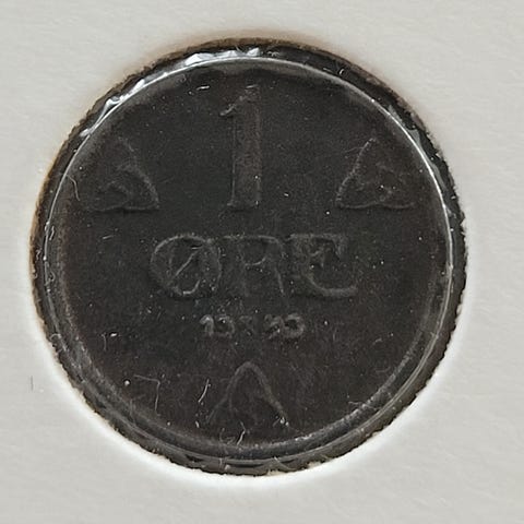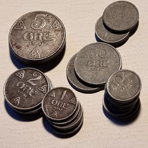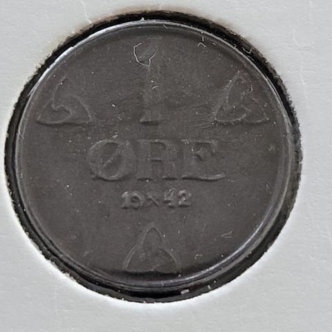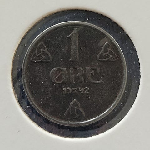 Materiale: Jern | Randtype: Glatt | Form: Rund | Vekt: 6,94g | Diameter: 27mm | Tykkelse: 1,9mm | Valør: 5øre | År: 1942
