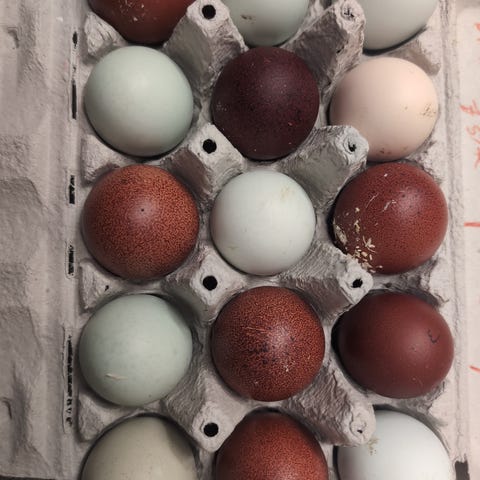 Her er bla Cream Legbar, Maran, Olive egger. Mix som legger lysebrune egg