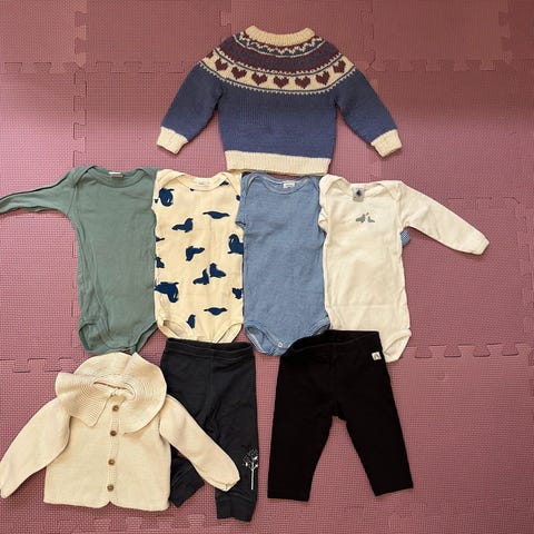Selger en stor klespakke i str 68 med ull og flere merkeklær.