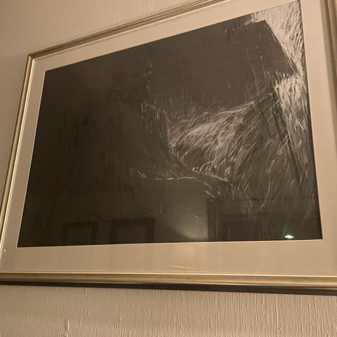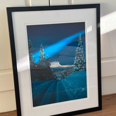 Rammen er i sort tre og har dessverre fått seg en liten skramme. Se bilde . Størrelse : 70x60 cm. Kontakt meg gjerne for mer informasjon.
