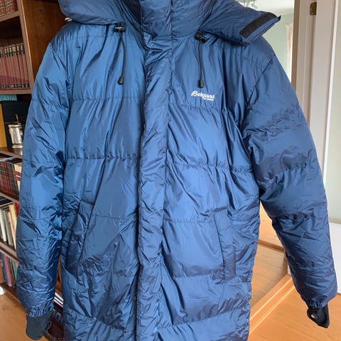 Selger en solid og varm vinterjakke fra Bergans i størrelse L for herre. Jakken er blå og fylt med dun, laget for å gi god varme og komfort på kalde vinterdager.