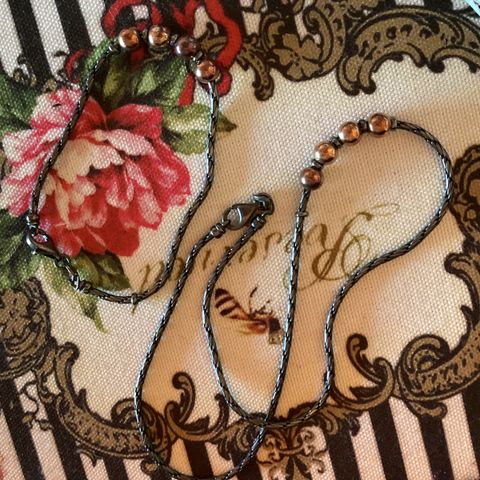 Dette er et sølvfarget halskjede med hjerteformede ledd og anheng, som ofte er assosiert med Y2K-stilen. Kjedet har en rekke store, flate hjerteformede ledd integrert i lenken, samt et par mindre, mer avrundede anheng som henger ned fra en ring. Ett av de hengende anhengene har en rød krystall eller stein i fronten.