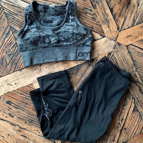 Sett med treningstøy for kvinner i størrelse S/ M fra ulike merker. Inkluderer ulike typer treningstights, shorts og topper i forskjellige farger og mønstre.