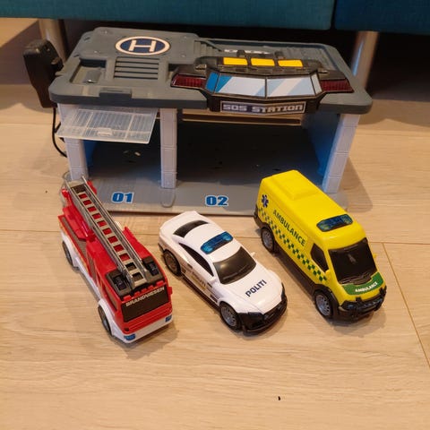 Selger en rednings stasjon med 3 biler. Den har knapper med lyd, og en mikrofon man kan snakke i.