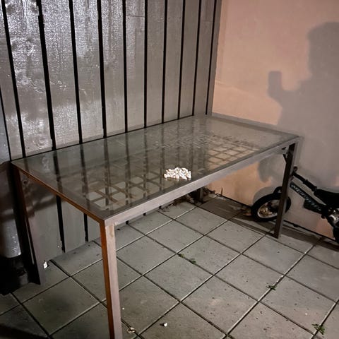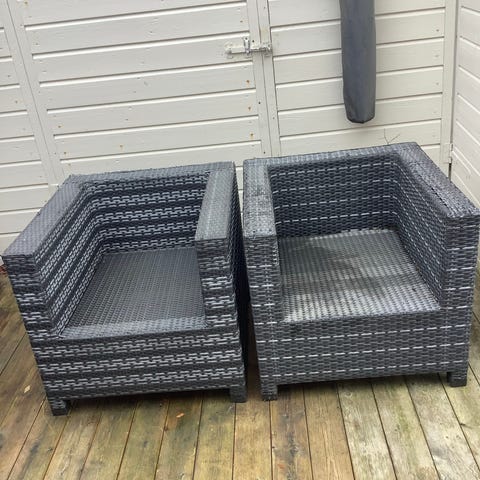 Hagemøbler gues bort. Uten puter. Og bordet mangler glassplatene