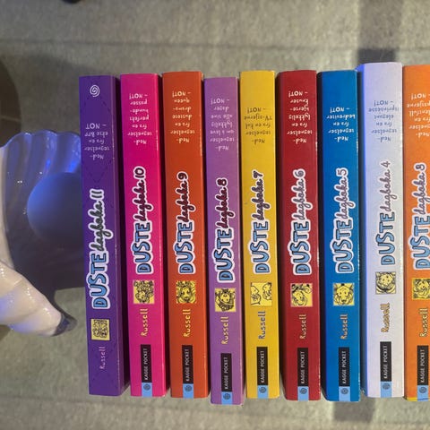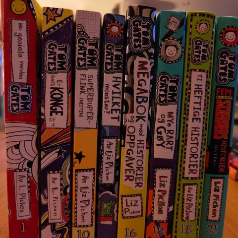 De to siste bøkene med eget bilde står det ikke nummer på. Den lilla er pocket, den røde er hardback.