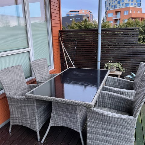 Dette er et kjøkkenbord som har blitt brukt ute som grillbord