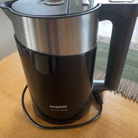 Bosch vannkoker med kombinasjon av rustfritt stål og svart plast. Utstyrt med håndtak i svart plast og vannivåindikator. Har base med kontrollknapper for enkel bruk og man kan regulere vanntemperaturen. Brukt, med noen bruksmerker, men fungerer ypperlig.