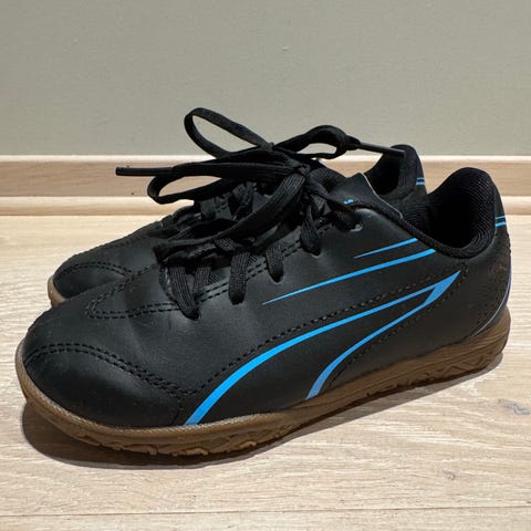 Puma fotballsko for barn i fargene hvit og rosa i str 28. brukt lite. Skoene har snøring og gummisåle med mønster for grep. Egnet for bruk på innendørs og utendørs underlag (brukt litt på kunstgress).