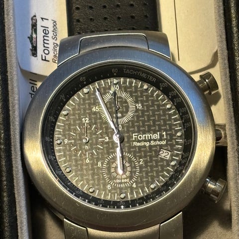 Det er et kutt/riss i glasset (se bilde). Klokka går, men er ikke nylig servet. Reima er slitt og bør byttes. Selges derfor som brukt med tydelige bruksmerker.