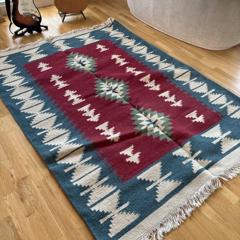 Gammelt gulvteppe, produsert mellom 1970-1980. Vil tro det er ull/ullblanding. Meget godt og varmt teppe. Det er dessverre for stort til å ha her hjemme. Det har ligget i kjelleren en stund, dermed trengs det nok en god runde med støvsugeren - helst rens. Kom med bud.
