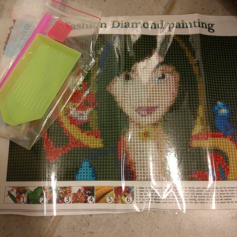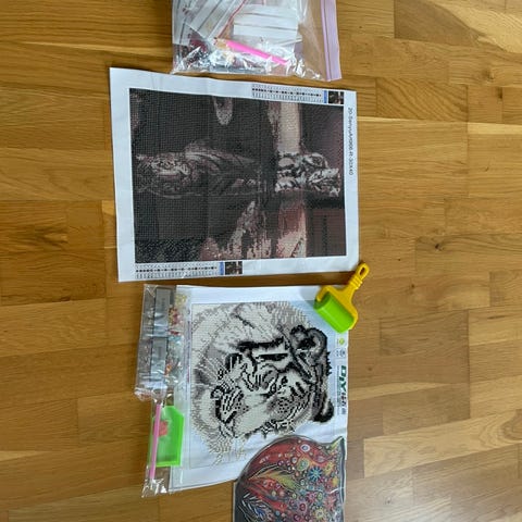 Diamond Painting sett bestående av tre forskjellige motiver: drømmefanger, hus med hage og blomster med pariserhjul. Inkluderer fargekodede diamanter og verktøy for påføring. Egnet for hobby og kreativt arbeid.