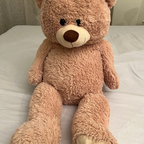 Kosedyr bamse iført gul overall. Myk og stor bamse med mørk brun og hvit pels. Passer som leke eller dekorasjon.