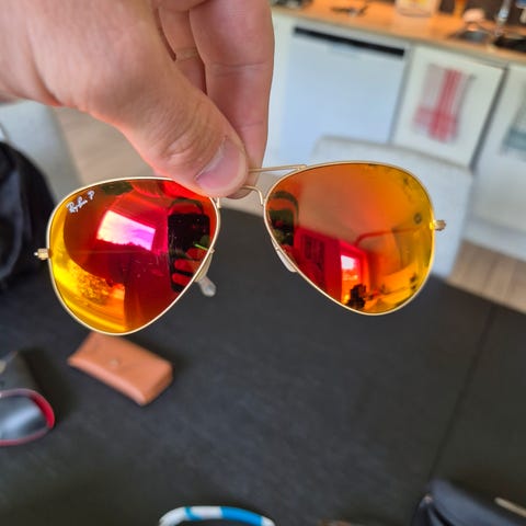 Ray-Ban 3734 ,solbriller for unisex med gullfarget metallramme og blå glass. Inkluderer etui for oppbevaring.brukt en sesong . Ingen riper. Som nye .