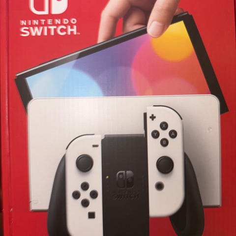 Nintendo Switch OLED konsoll i hvit farge. Inkluderer OLED-skjerm for forbedret visuell opplevelse. Konsollen kan brukes i håndholdt modus, bordmodus og tilkoblet TV. Pakken inneholder konsoll, dock, Joy-Con-kontrollere i hvit, ekstra Joy-Con-kontrollere i gult og rosa, ladekabler og original etui