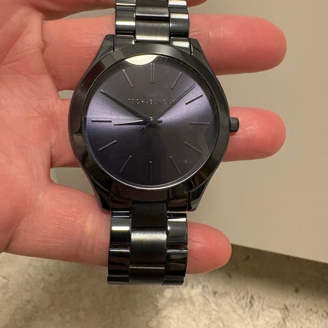 Michael Kors 5303 dameklokke. Klokken trenger nytt batteri, har normale bruksmerker på reim, liten flekk på glass og mangler to bokstaver under glasset (se bilde).
