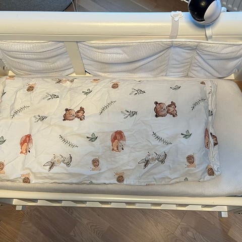 Troll bedside crib i hvit farge. Designet for å plasseres ved siden av voksenseng for enkel tilgang til barnet. Den ene kanten kan justeres opp og ned. Vi har hatt den ved siden av vår egen seng i flere måneder nå med vår baby, som har sovet supergodt i den - men har vokst utav den nå. Madrass kan følge med.