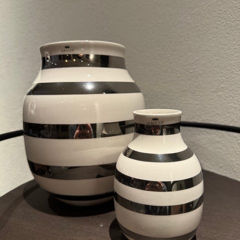 Kähler vase med sølv og hvite horisontale striper. Laget i keramikk. Høyde ca. 18 cm. Designet for dekorative formål. Selges 150kr.