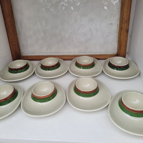 4 kuverter med kopper med diameter 9,5cm og høyde 6cm, skåler på 15cm og asjetter 19,5cm. Ingen skader og lite slitasje. 300 pr kuvert.