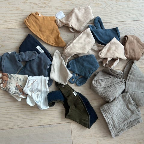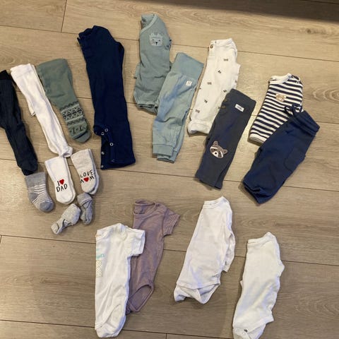 Stor klespakke til baby str. 56-68 selges. Inneholder totalt 41 plagg (+4 par sokker).