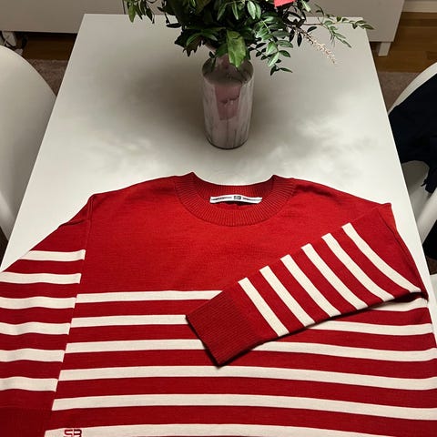 Dekorativ strukturstrikk langs kantene.