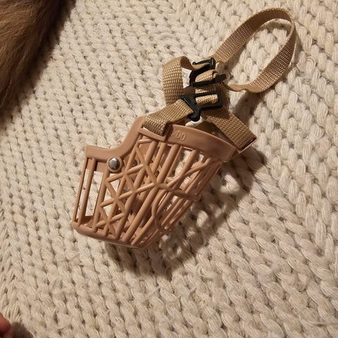 Munnkurv til hund med lærreimer. Munnkurven er laget av plast og har justerbare lærreimer for feste. Ble brukt til en Alaska Husky tispe.