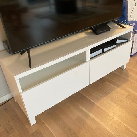 Tv benk i stål og glass. Tv følger med. Hentes på Spanne.