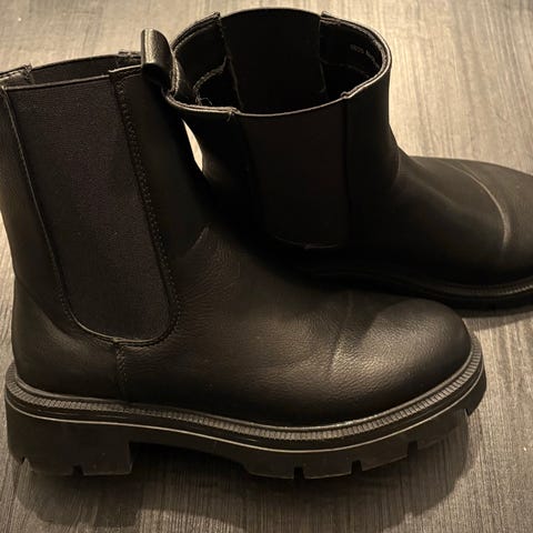 boots i skinn, størrelse 38, farge svart. Støvler med elastiske sidepaneler og grovmønstret såle for bedre grep. Passer til hverdagsbruk og ulike anledninger.