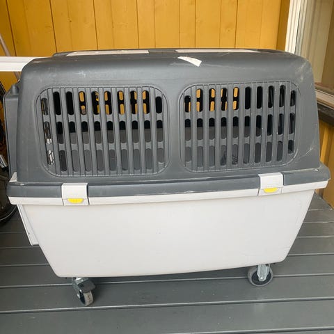Transportbur for kjæledyr med plastkropp i to farger og metallgrind. Designet for sikker transport av små til mellomstore dyr. Svært lite brukt, som nytt.