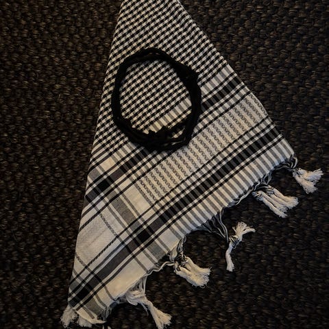 Palestinaskjerf er et tradisjonelt arabisk hodetørkle (kefije) formet som et firkantet skjerf av bomull. Brukt 1 gang i Dubai. Selger to skjerf: rødt og svart samlet.