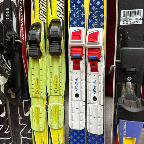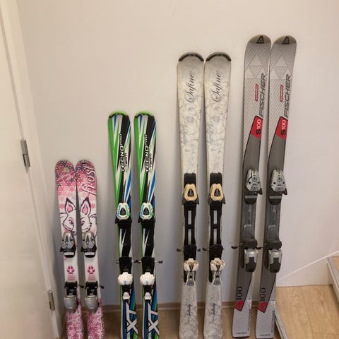 Tre par langrennski i tre ulike størrelser og et par slalåmski