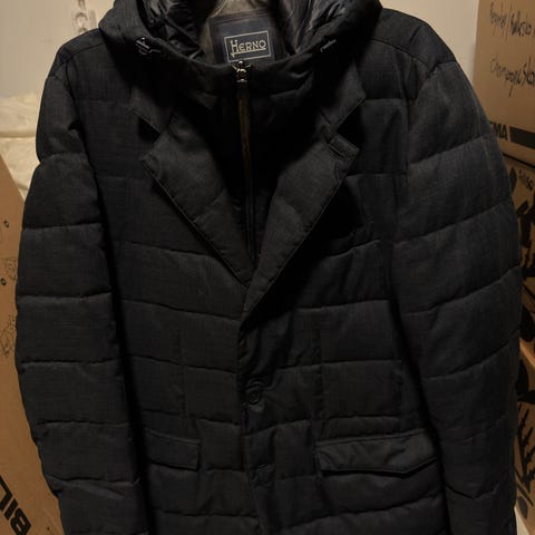 Jakken er str 50 noe som tilsvarer en M. Og passer en person på 180. Herno er en vinterjakke av høy kvalitet med små detaljer som gir den et unikt utseende