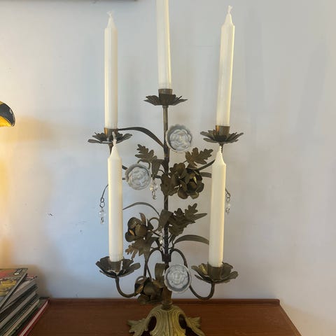 5 armet Lysestake i messing og blå porselen fra Danske G&C.